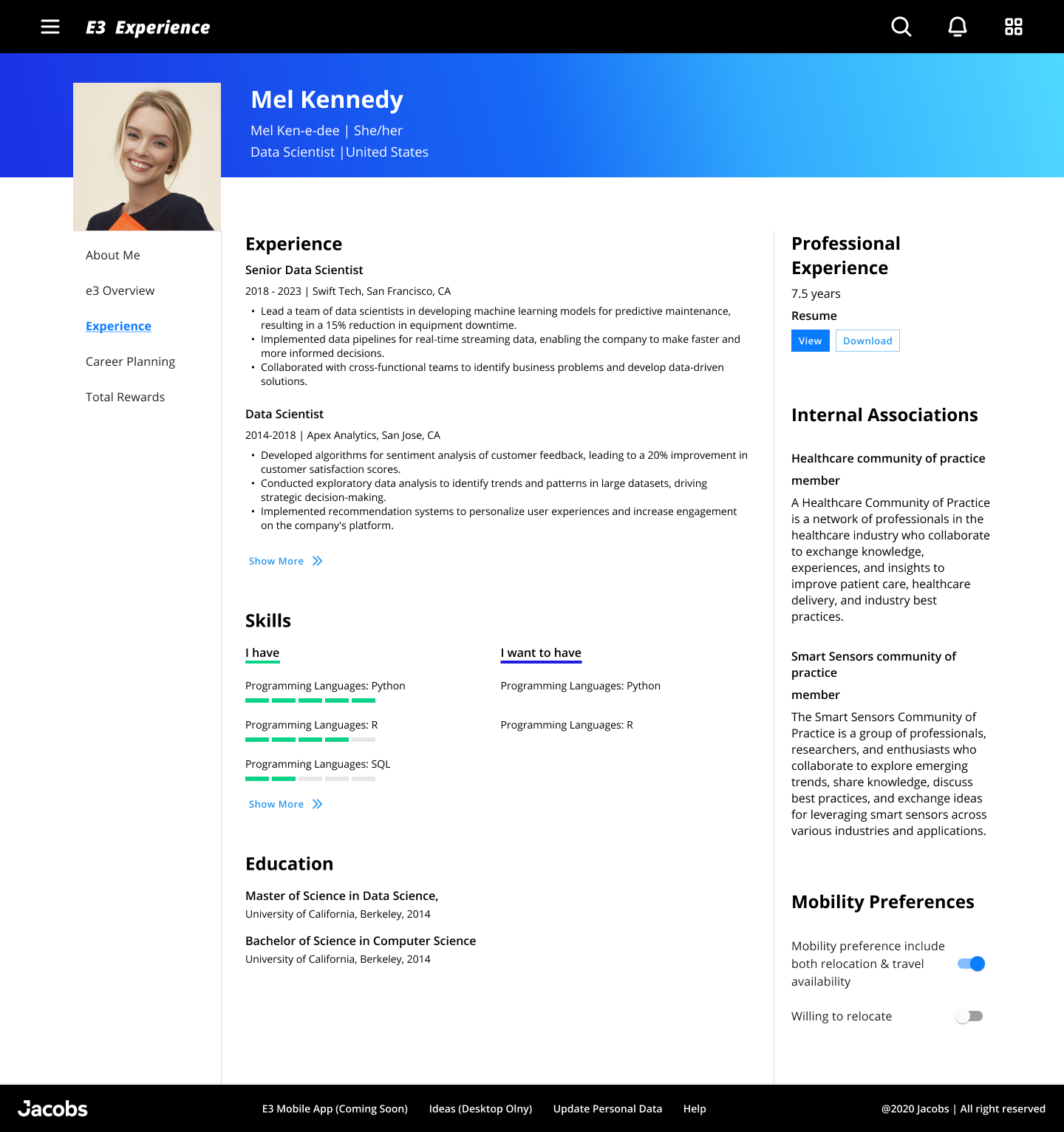 The profile encapsulates pertinent details of an employee's career progression and accolades within the organization,